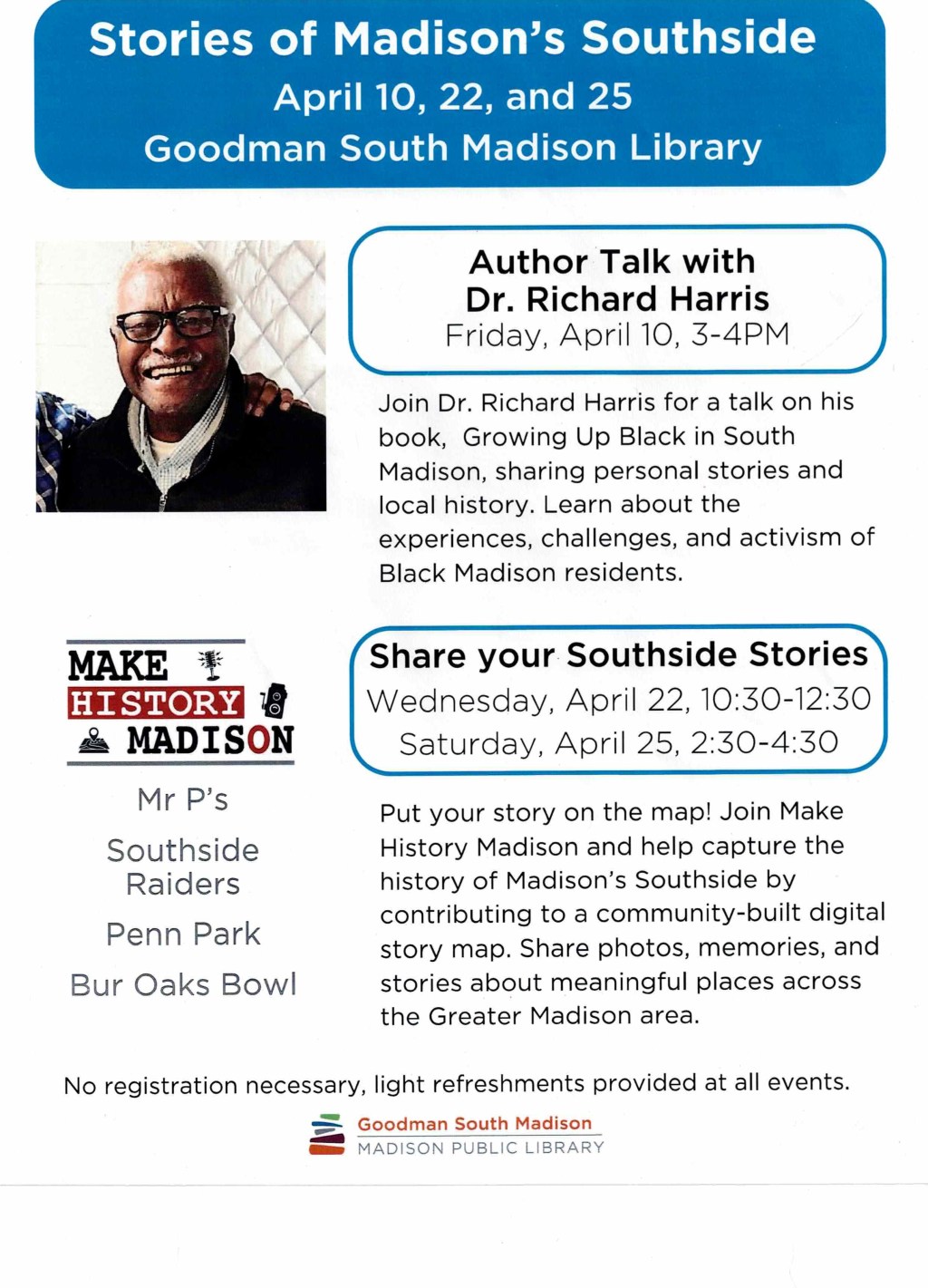 Join Dr. Richard Harris for a talk on his book, Growing Up Black in South Madison on Friday, April 10th, 3-4pm at Goodman South Madison Library.